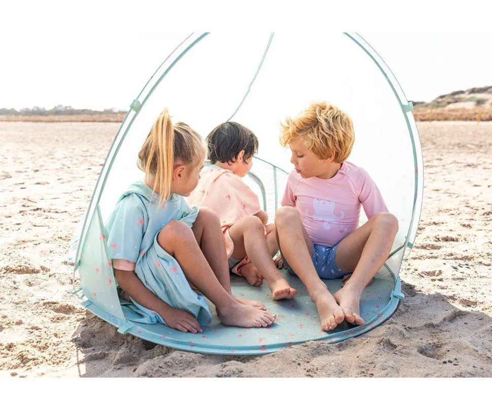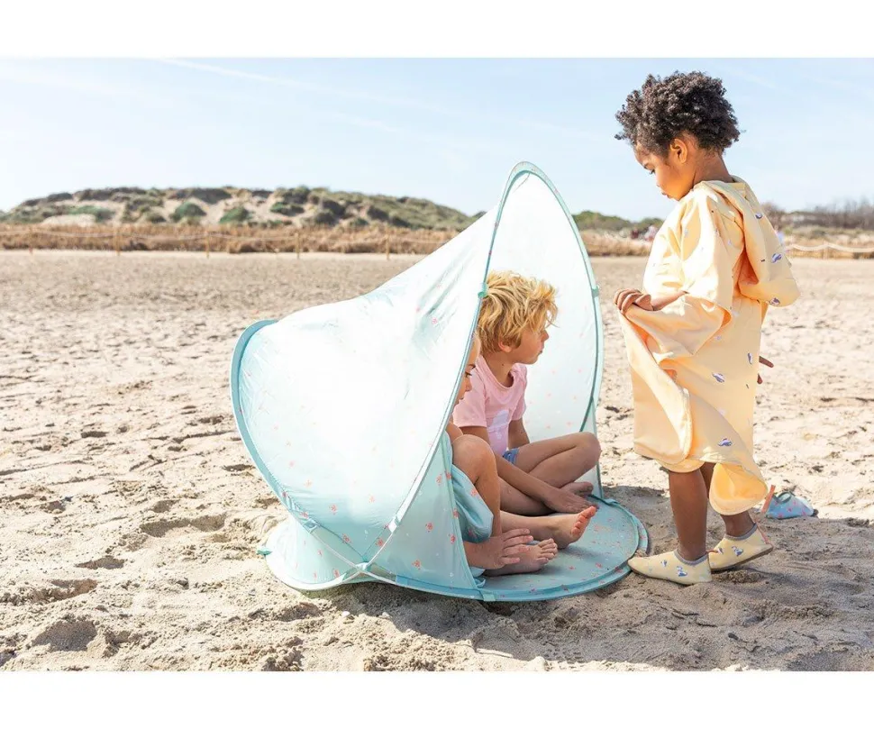 Práctica carpa pop-up de la colección Crab Sage, perfecto para que los peques disfruten de días de playa, piscina o campo protegidos de los rayos solares. Es muy fácil de instalar y transportar y cuenta con protección 50+UPF.