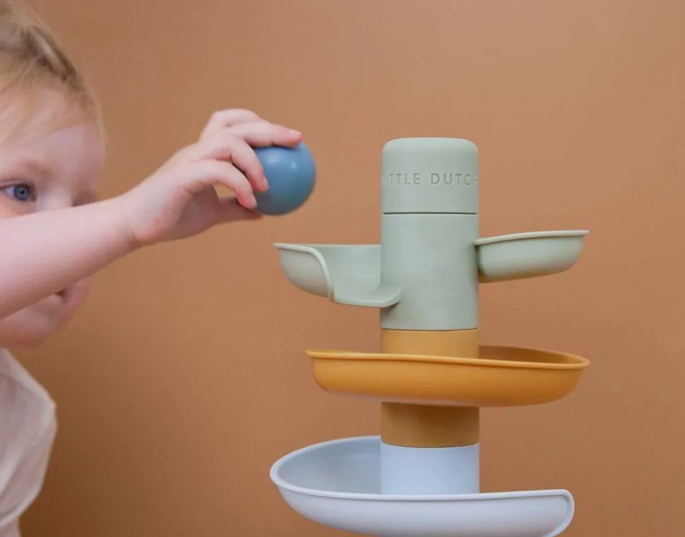 El colorido juguete consta de 5 piezas de tonos suaves que su pequeño puede apilar fácilmente. Deje caer las bolas una por una en el nivel superior y vea cómo cada una de ellas se enrolla y rueda hacia abajo.