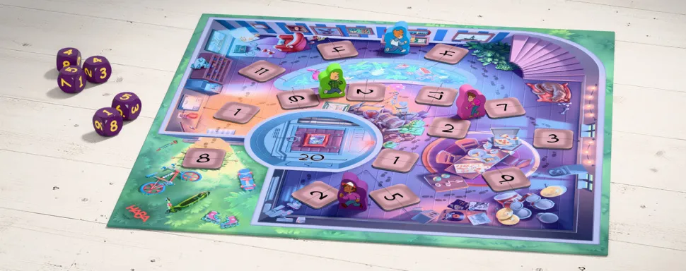 El clásico de HABA ahora renovado con una estupenda nueva imágen. Juego de cálculo en el que por turnos deberemos tirar los 6 dados y combinar el resultado obtenido ya sea sumando, restando, multiplicando o dividiendo, para así obtener los códigos que nos permitirán avanzar por la casa del profesor hasta alcanzar el cómic y recuperarlo. Permite distintas variantes de juego y distintos niveles de dificultad.