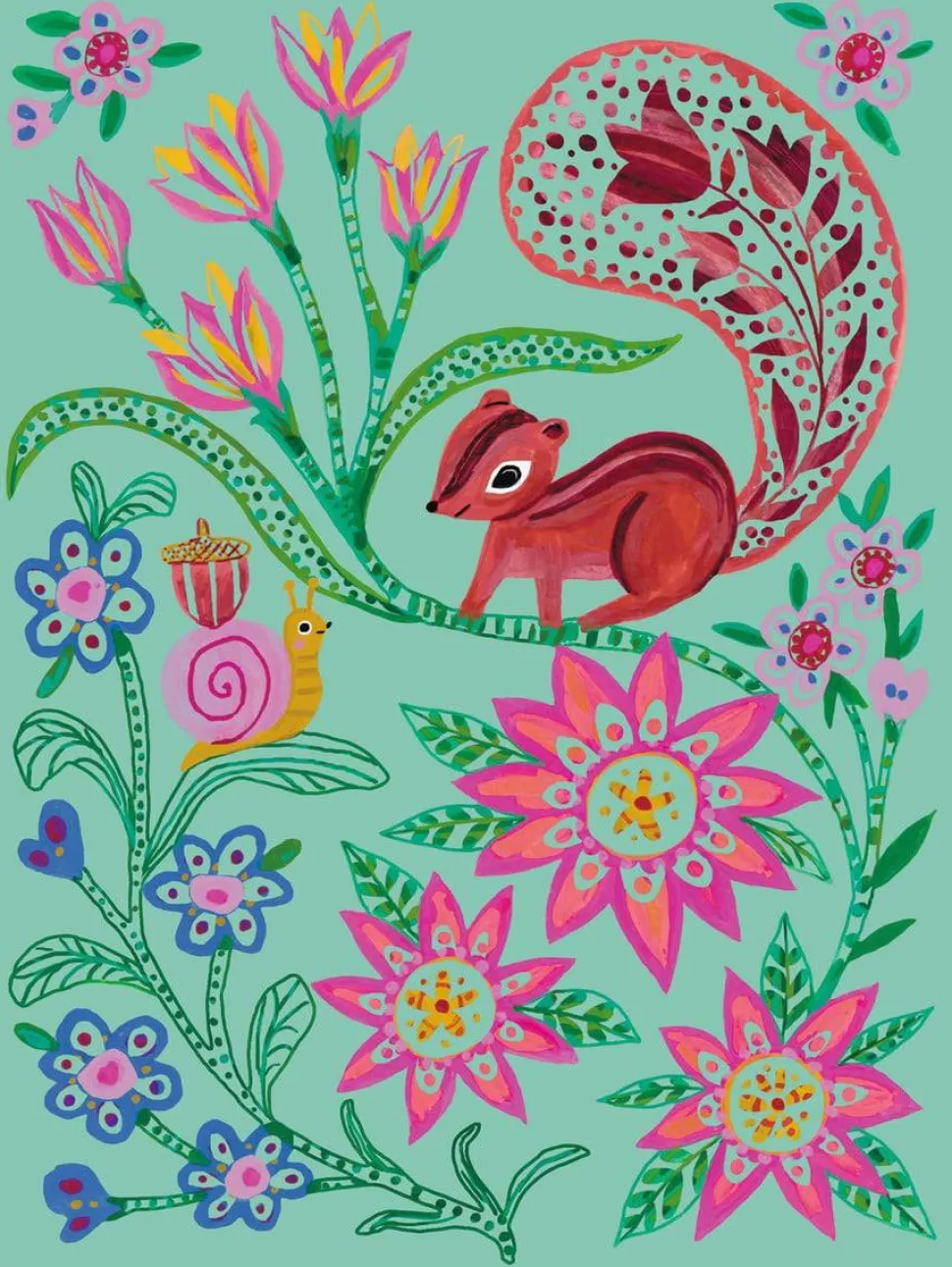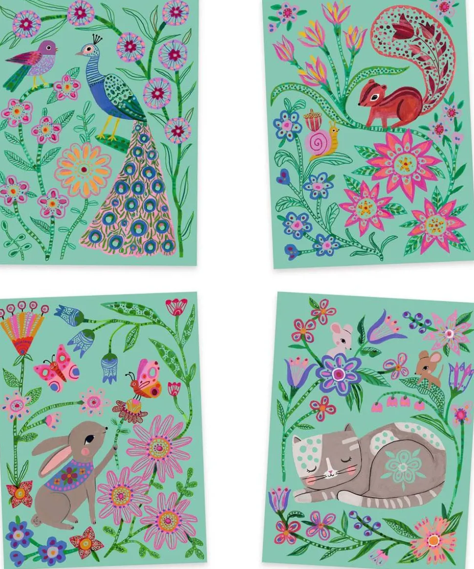 Un estuche de 4 tarjetas para rascar con adorables ilustraciones: los animales del jardín se encuentran en una decoración floral. El niño reproduce los dibujos imaginados por el artista raspando la superficie con el punzón