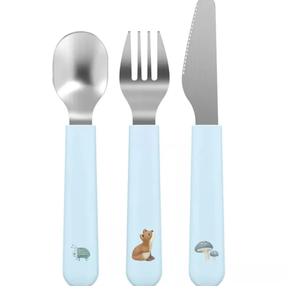 Para niños pequeños y preescolares (2 a 3 años). Hecho de acero inoxidable, con mangos de plástico que los hacen cómodos de sostener. Libre de BPA. Apto para lavavajillas.