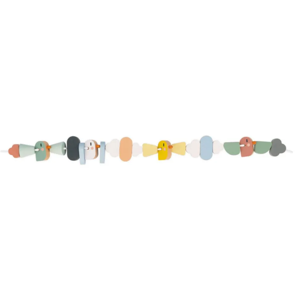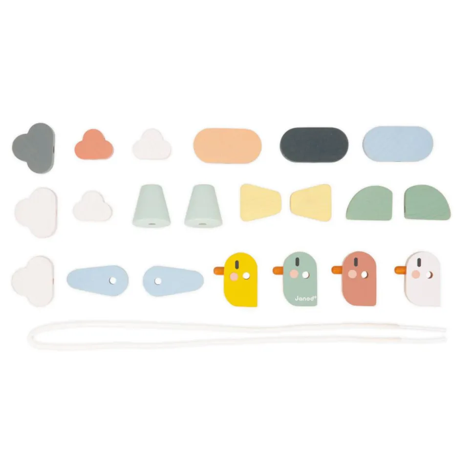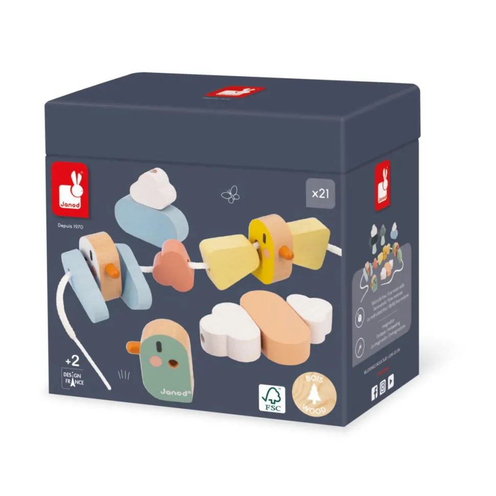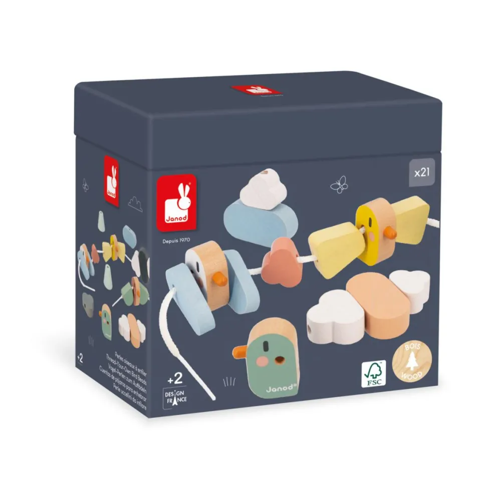 ¡PÍO, PÍO! ¡Mira los pájaros posados en lo alto entre las nubes! Acompañe a su hijo en el desarrollo de su motricidad enhebrando las diferentes cuentas en el cordón. En este juguete encontrará 4 cuentas de pájaros, 8 cuentas para las alas, 9 cuentas para formar las nubes y un cordón grande con puntas rígidas para que las cuentas sean más fáciles de enhebrar. Este juguete es perfecto para acompañar a su hijo en el desarrollo de su imaginación y su motricidad.