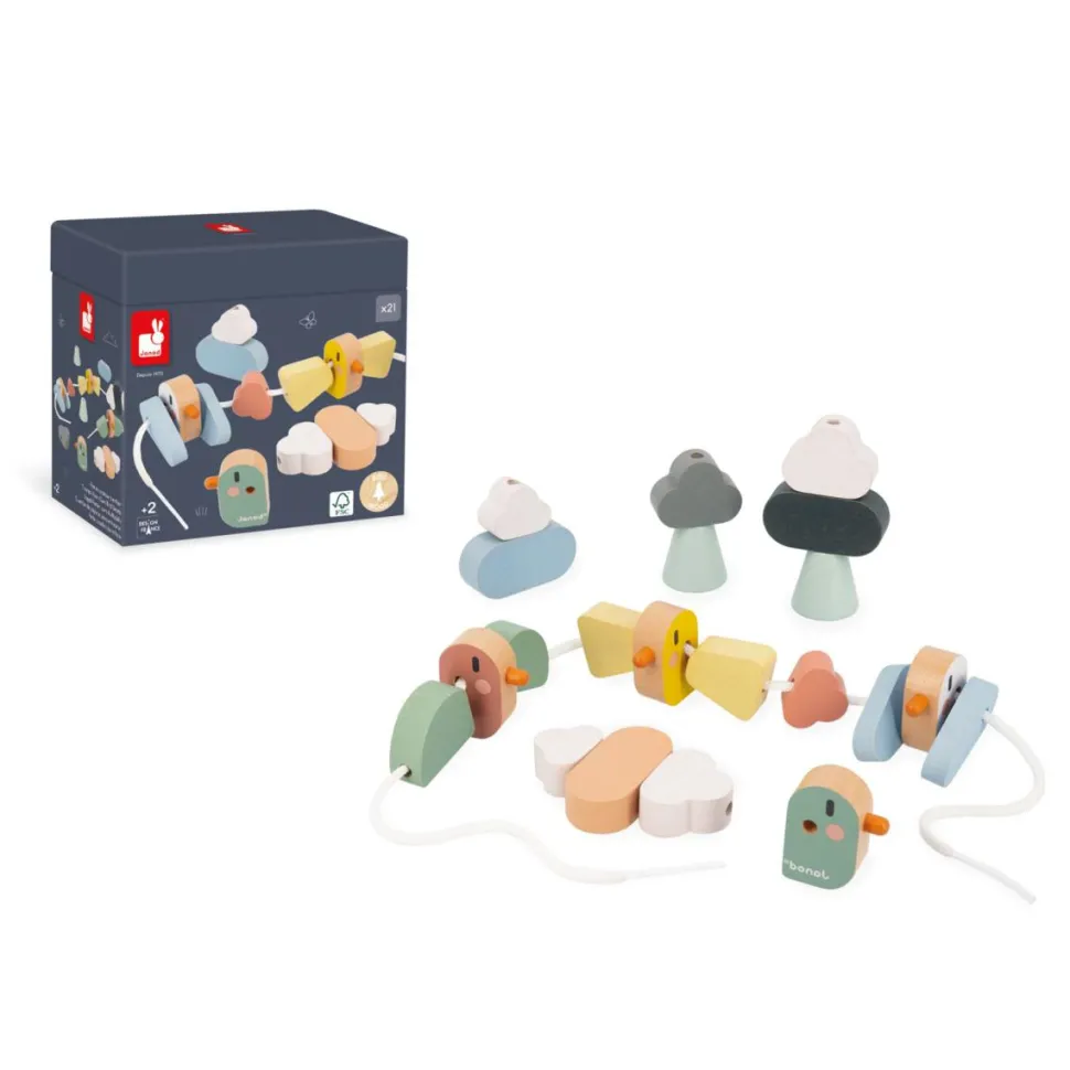 Los cordeles tienen unas puntas rígidas en los extremos para facilitar el paso de las cuentas: ¡ideal para sus manitas regordetas! Este juguete de primera infancia también estimula la imaginación del niño, ya que las piezas se sostienen en pie y se convierten en verdaderas figuras.