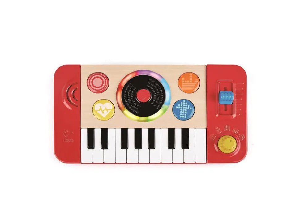 ¡Los pequeños aspirantes a DJ podrán pinchar sus primeras canciones con este estudio portátil! Con él, podrán tocar el teclado con uno de los cuatro sonidos instrumentales o 18 graciosos efectos de sonido, o también podrán iniciar una de las 5 tonadas de fondo y utilizar el deslizador de tempo para cambiar la velocidad, añadir efectos de sonido DJ ¡y pinchar el vinilo!