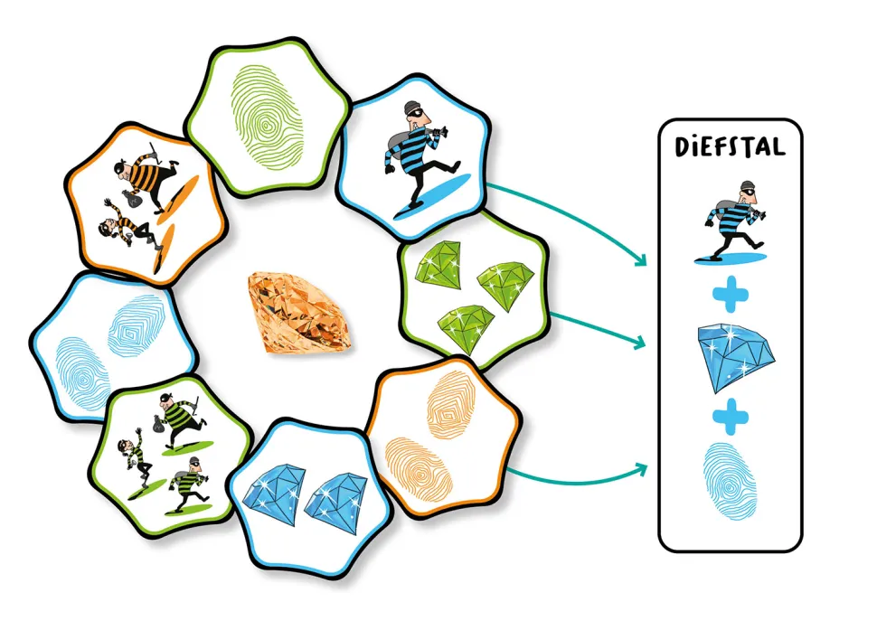 El primero/a en encontrar una combinación correcta de diamantes, ladrones y huellas, y coger el diamante, se quedará con esas cartas. Y así, quien consiga más cartas al final, será el ganador.
