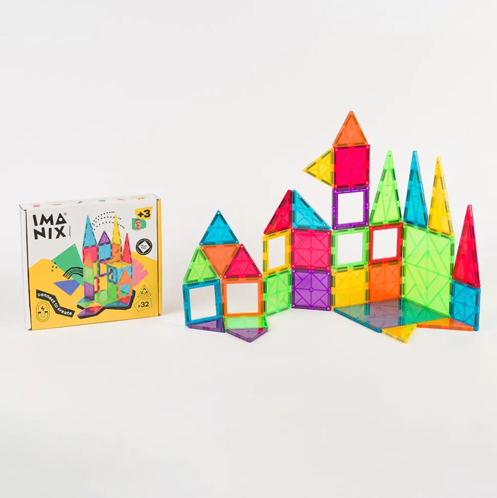 Imanix está compuesto de piezas geométricas de diferentes tamaños, formas y colores realizadas en plásticos no tóxicos traslúcidos cuyos perfiles contienen los imanes en su interior. Esta disposición de los imanes asegura que no exista ningún riesgo de que niños o niñas puedan tragarse por error un imán, ya que están incrustados en el interior de cada pieza y no son piezas sueltas. Además, estos Imanix 32 se presentan en una caja de dimensiones asequibles y repleta de diversión. Imanix 32 piezas contiene un surtido interesante de piezas para aproximarse a esta marca y empezar a imaginar y construir.