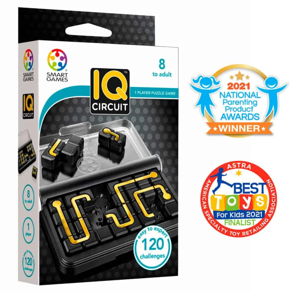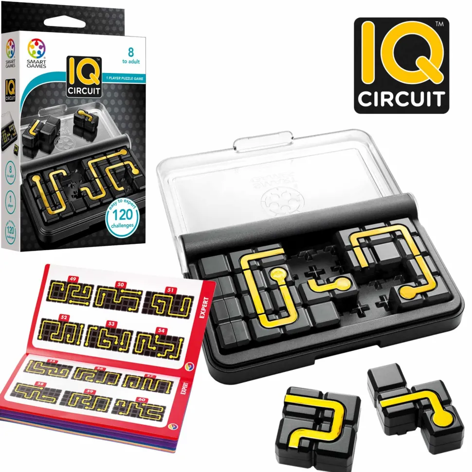 Coloca todas las piezas del IQ Circuit en el tablero de juego para crear circuitos. Cada reto muestra 2, 4 o 6 puntos de conexión; un circuito empieza y termina con un punto. Solamente hay una solución.