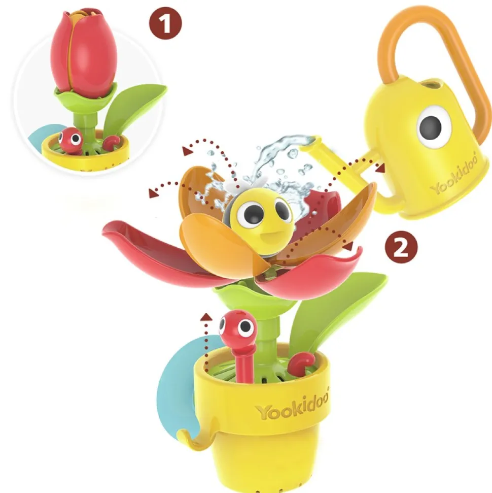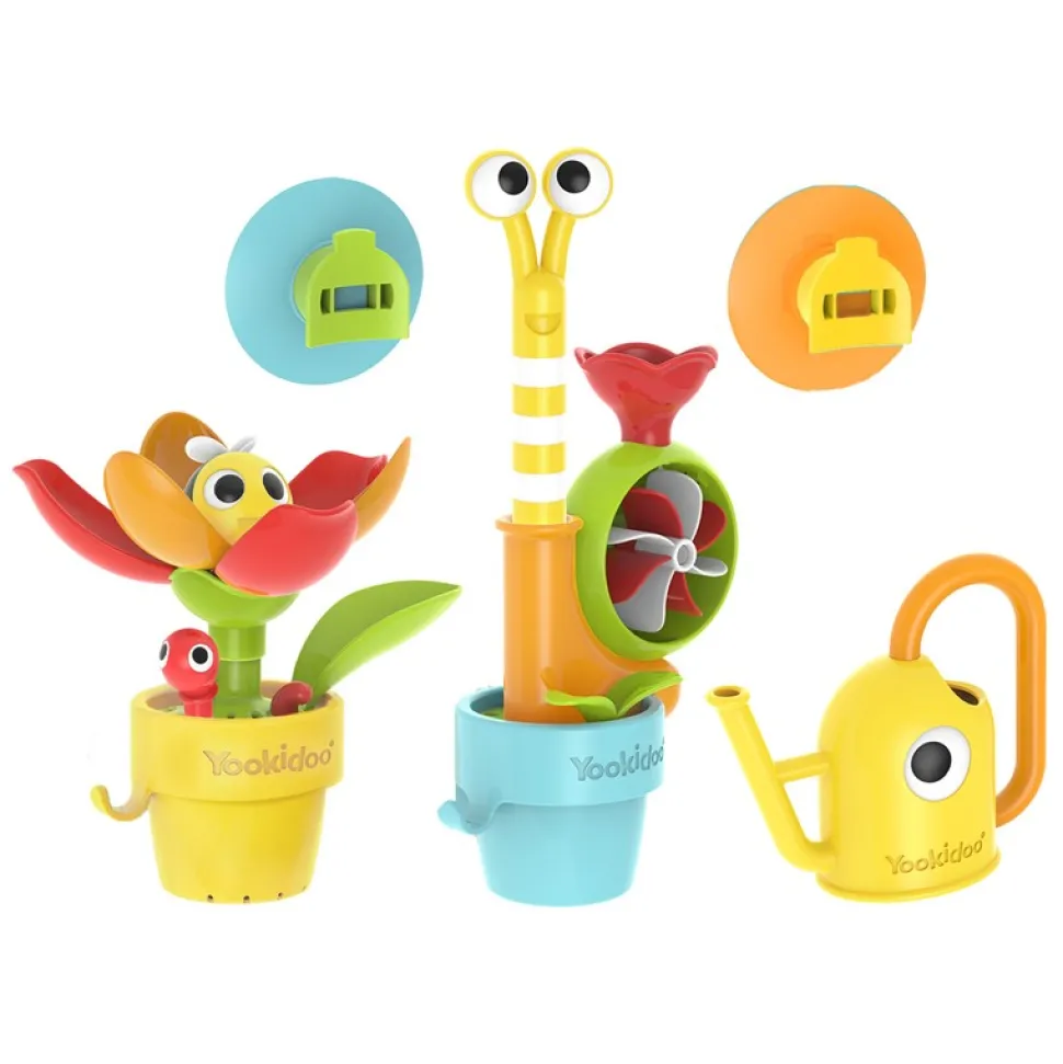 Set compuesto por tres juguetes para la bañera de la Serie Jardín de Yookidoo. Lo compone: Cucu abeja flor, Sube sube caracol y pica pica en la bañera.