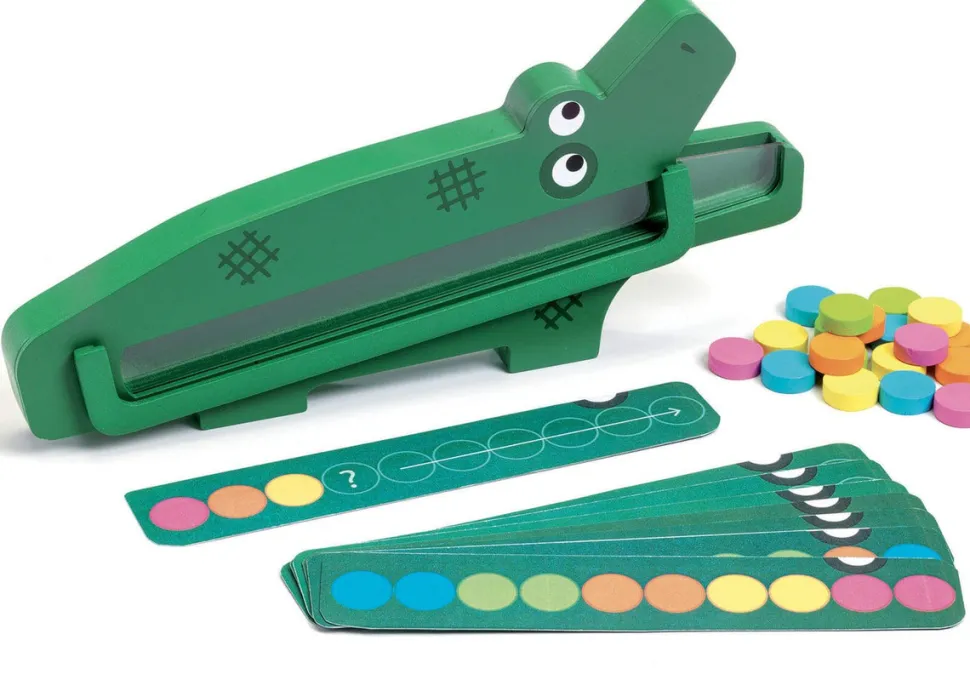 Un cocodrilo de madera que devorará las fichas de colores. El niño ubica la tarjeta ocultando la barriga del cocodrilo. Luego, coloca las fichas de color siguiendo las instrucciones de la tarjeta sin mirar. ¡A partir de los 3 años, para aprender jugando!