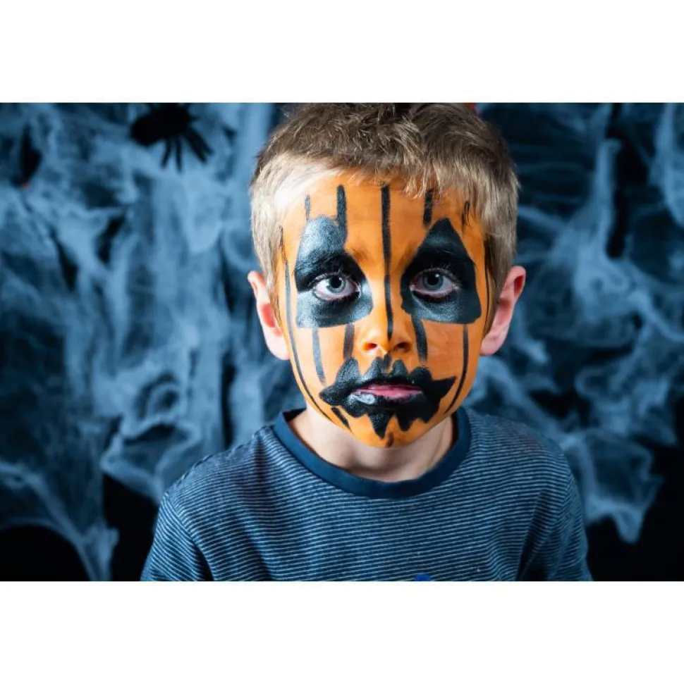 ¡Divertida calabaza o terrorífico esqueleto! Crea personajes con este kit de 3 colores biocertificado de maquillaje al agua hipoalergénico y orgánico certificado.