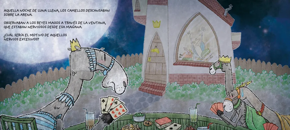 Aquella noche de luna llena, los camellos descansaban felices sobre la arena. Observaban a los Reyes Magos a través de la ventana, que estaban nerviosos desde la mañana. Todo debía estar perfecto, esa noche no podía fallar nada. Su querido invitado merecía una cena de gala. ¿Conseguirán que la noche sea un éxito? ¿Evitarán todos los contratiempos?
