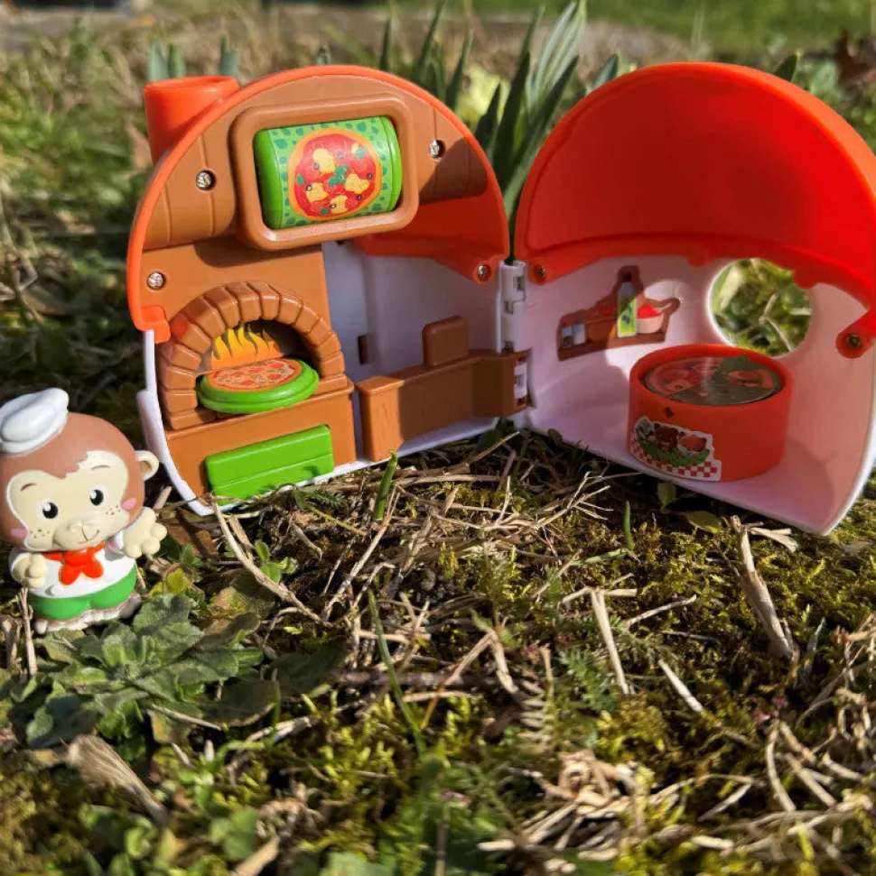 Hay un montón de acciones y sorpresas por descubrir para contar tus propias historias: un menú desplegable para elegir la pizza, un botón emergente para sacar la pizza del horno y una mesa reversible.