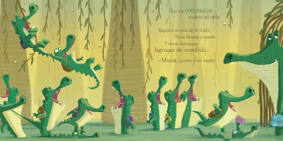 Los animales vuelven al cole. A la entrada, los caracoles, tímidos, juegan escondidos. Al pequeño elefante le pesa demasiado la mochila y los cocodrilos no dejan de llorar. ¿Y qué hacen los ratones, los lobos y los osos?
