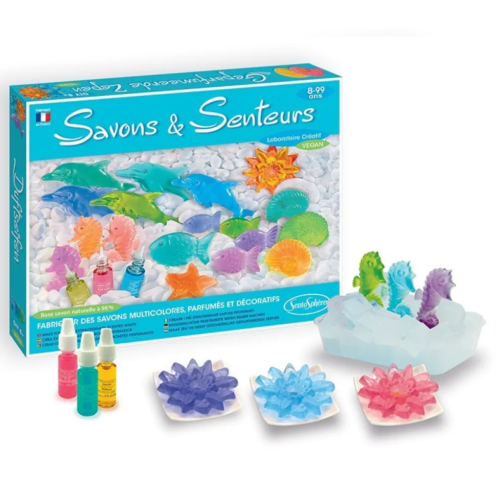 Este pequeño laboratorio de cosmética te permitirá crear 450 gramos de preciosas pastillas de jabón con forma de delfines, conchas y flores en los colores y aromas que elijas.