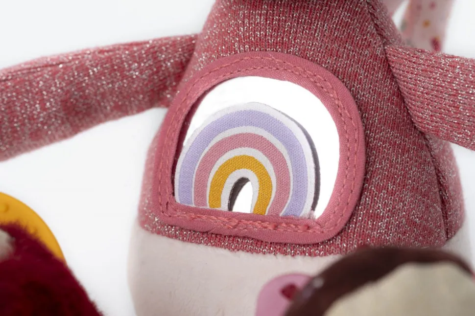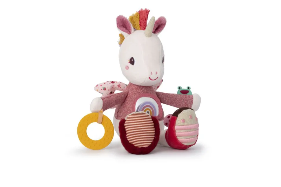 Lena la unicornio ofrece una multitud de actividades para despertar los sentidos de los más pequeños. Equipada con un anillo de dentición suave, un espejo cubierto con un arcoíris y una melena peluda multicolor, este compañero mágico está lleno de sorpresas.