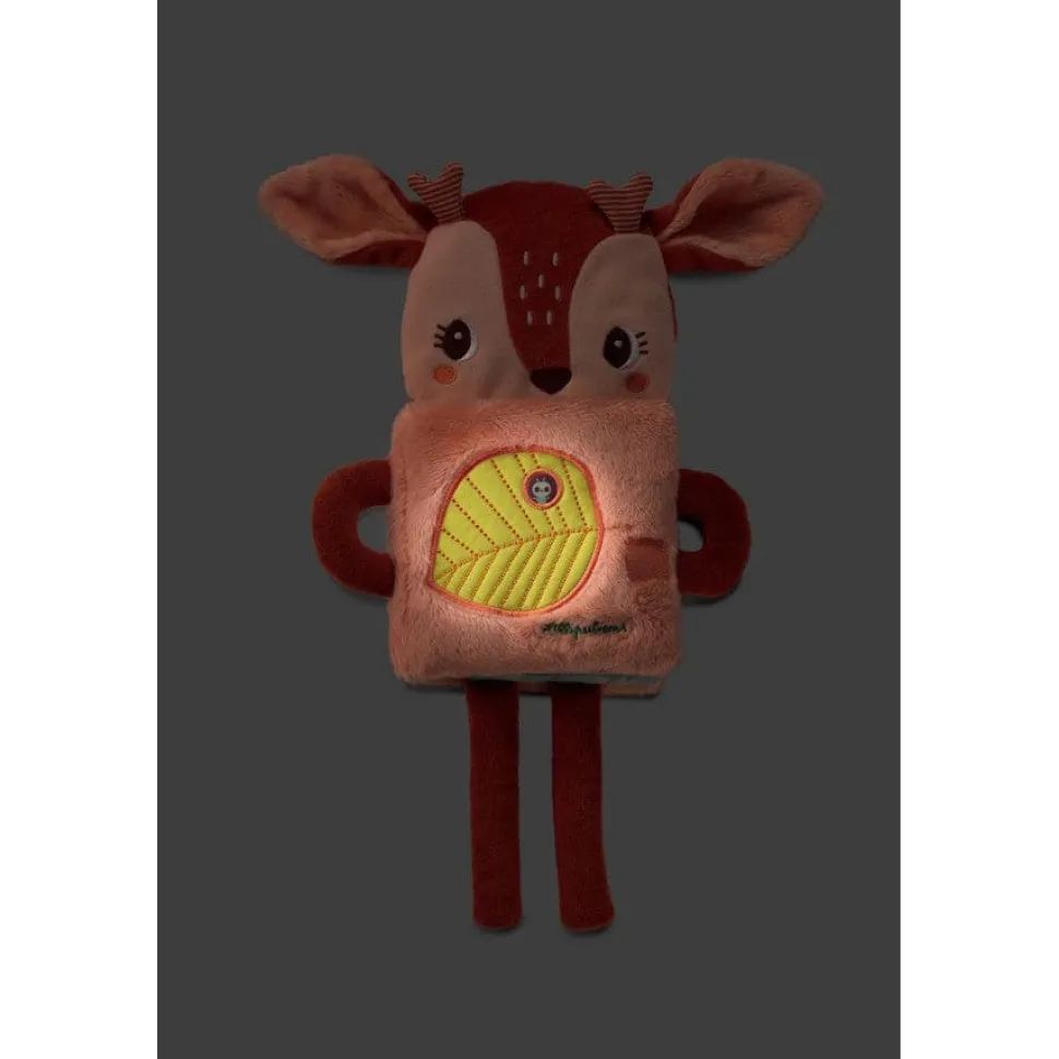 Este irresistible libro-doudou seguro que tranquilizará a tu bebé. El libro ofrece una serie de actividades relajantes. El suave tejido y los simpáticos morritos piden mimos. Cuando se apague la luz, la ilustración de la tapa se iluminará, convirtiéndose en una luz nocturna hasta que tu bebé se duerme