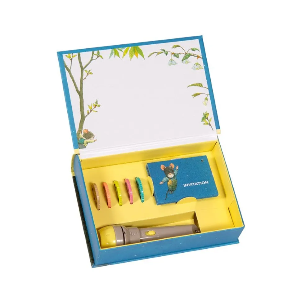 Caja magnética con forma de libro. La tapa se puede usar para proyectar la imagen. Incluye linterna y 5 discos de cuentos
