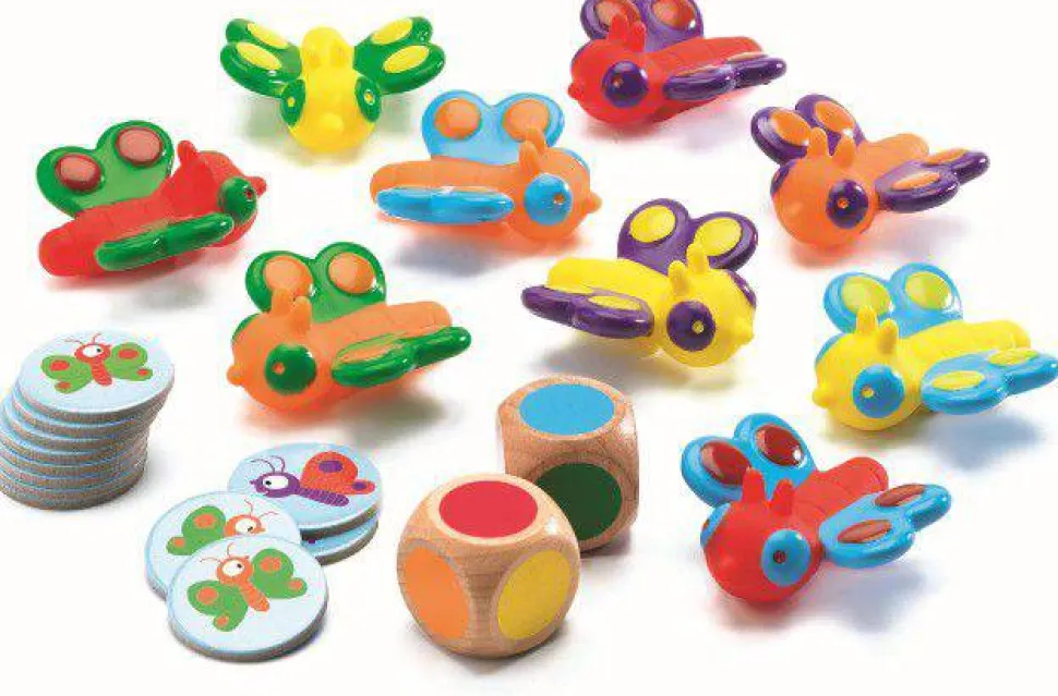 Contenido: 9 mariposas bicolores de plástico blando, 2 dados de madera de colores, 30 fichas. Reglas del juego en 10 idiomas.