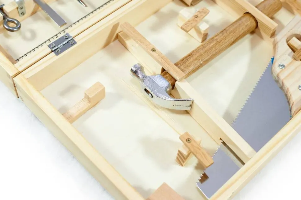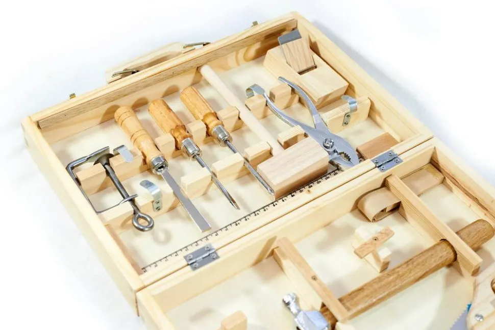 Martillo, maza, formón, destornilladores, escuadra, un berbiquí para taladrar o hacer agujeros, nivel, alicates, regla de madera o gato, serrucho… y así hasta 14 instrumentos de carpintería para que, vuestros hijos, ¡puedan hacer bricolaje en casa!