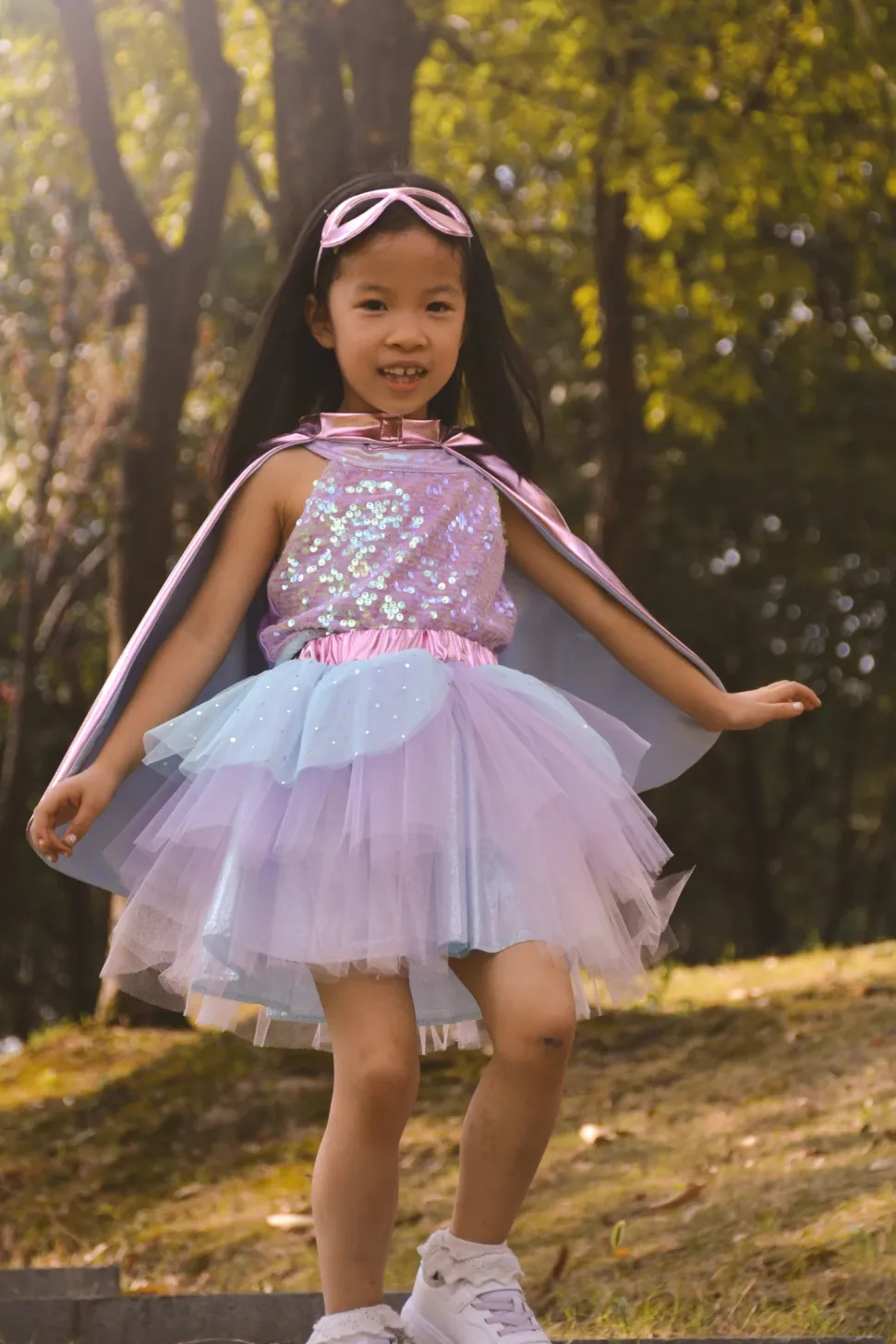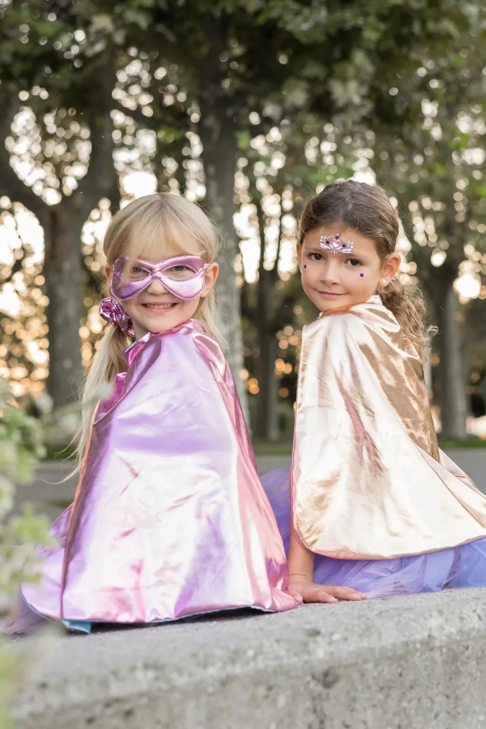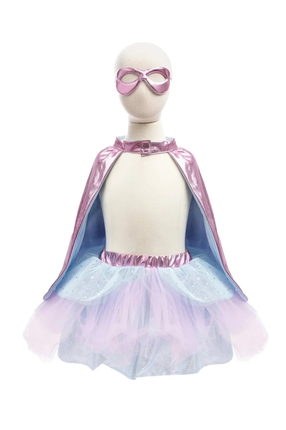 ¡Estos diseños pueden ser atuendos de superhéroes o de estrellas de rock! Las pretinas están envueltas en tela para un buen acabado y comodidad. Los emblemas en la parte posterior de las capas están bordados alrededor de los bordes para lograr un bonito acabado. La capa holográfica rosa está forrada para un acabado muy elegante. Estrellas y relámpagos en las faldas con una pequeña pieza de fieltro redondo en la parte posterior para sujetarlos de forma segura al tul. Las faldas tienen un peplum y dos capas de tul con una fantástica capa de forro inferior metálica arrugada. Las máscaras son de doble cara y tienen una función de rayo para combinar perfectamente con el conjunto