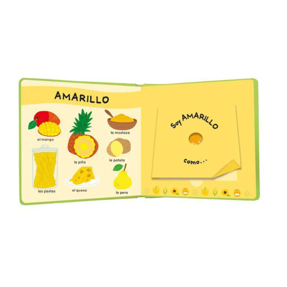 En cada doble página encontrarás alimentos y otros objetos del mercado del mismo color, y también una gran solapa bajo la cual está escondida la imagen real…