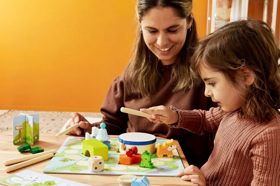 CONTENIDO: 1 tablero impreso por ambas caras (anverso «Camino Musical», reverso «Concierto de Animales»), 4 juguetes sonoros (tambor, sonajero, campana, abrazaderas), 5 varillas sonoras, 4 amigos (la ratita Rita, el perro Pedro, la rana Rania y la gata Gala), 12 tréboles, 4 cartones impresos a doble cara (anverso «Partitura», reverso «4 Amigos»), 24 fichas, 1 indicador (de 2 piezas, ensambladas), 1 dado, 1 instrucciones del juego.