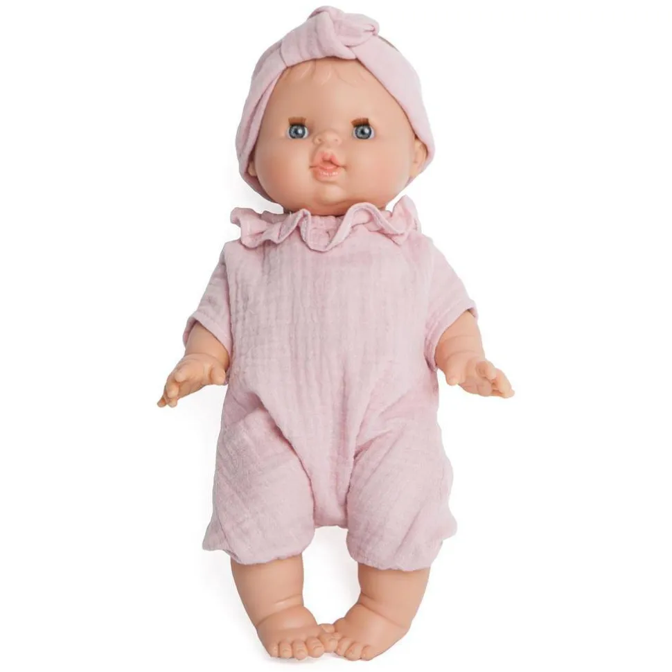 Muñeca bebé Bobble rosa niña con piel clara, ojos azules y pestañas, de Barrutoys.