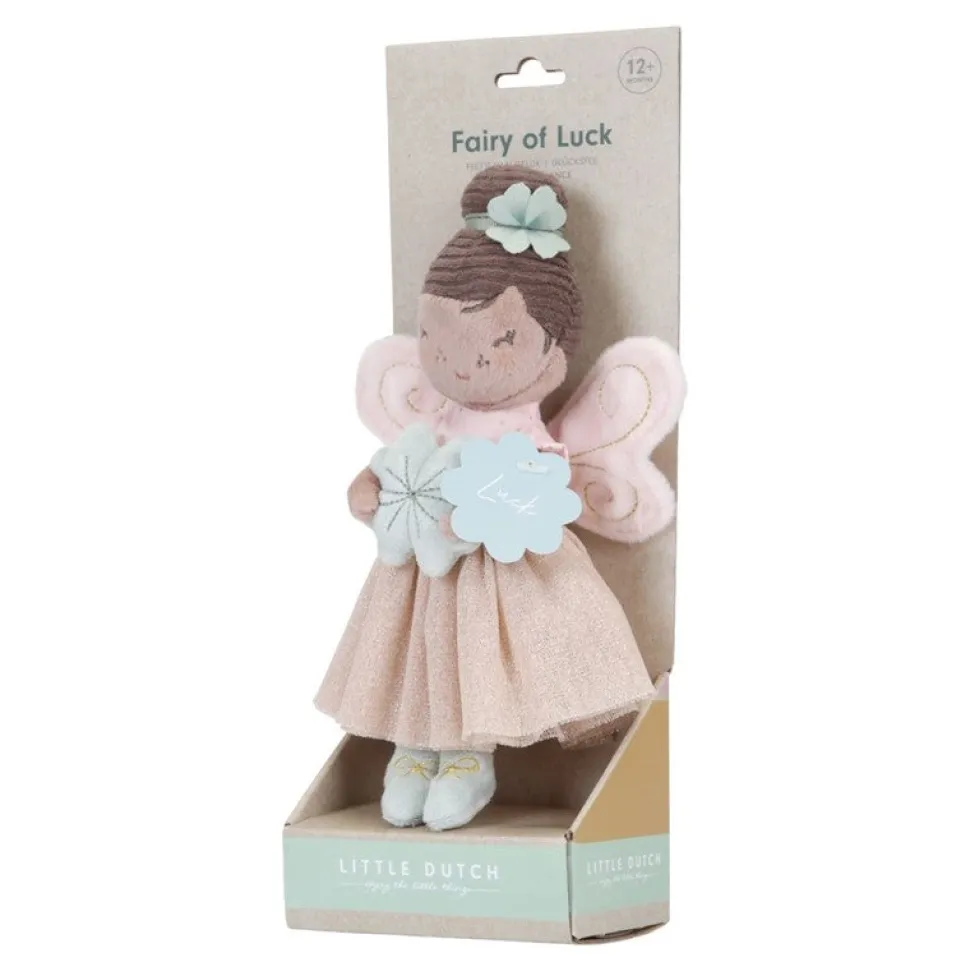 Esta pequeña hada trae buena suerte, con su polvo de hadas que rocía felicidad y sonrisas a tu alrededor. Desde un mundo mágico muy lejano el hada Ella viene a tu casa para traerte suerte con su trébol de cuatro hojas. Ella será tu mejor amiga y te cuidará siempre y en todas partes. Con su vestido rosa, su cabello castaño en un moño, sus alas de hilo dorado y sus zapatos de bailarina, Ella les encantará a todos los niños para jugar y divertirse. Esta hermosa hada estimulará la imaginación.