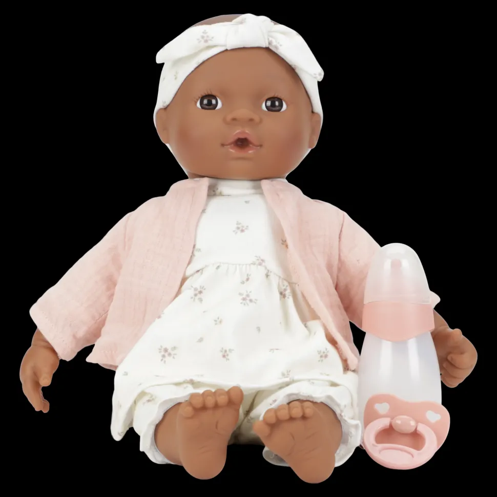 Conoce a la bebé Noa. Dale un abrazo y cuídala. Noa es una muñeca adorable y realista, con un cuerpo suave y mimoso, a la que le encanta que la quieran. Puedes cambiarle de ropa, ayudarla a dormir y calmarla con el chupete. Cuando tenga hambre, ofrécele el biberón de leche. A los niños les encanta imitar todo lo que hacen sus padres, y esta muñeca inspirará a su pequeño a participar en juegos de roles de crianza y cuidado. Noa está vestida con una diadema, un vestido y pantalones del diseño White Meadows, con un chaleco rosa suave.