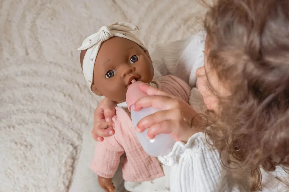 Cambiarle de ropa promueve la motricidad fina, y el chupete y el biberón añaden un elemento de juego interactivo.