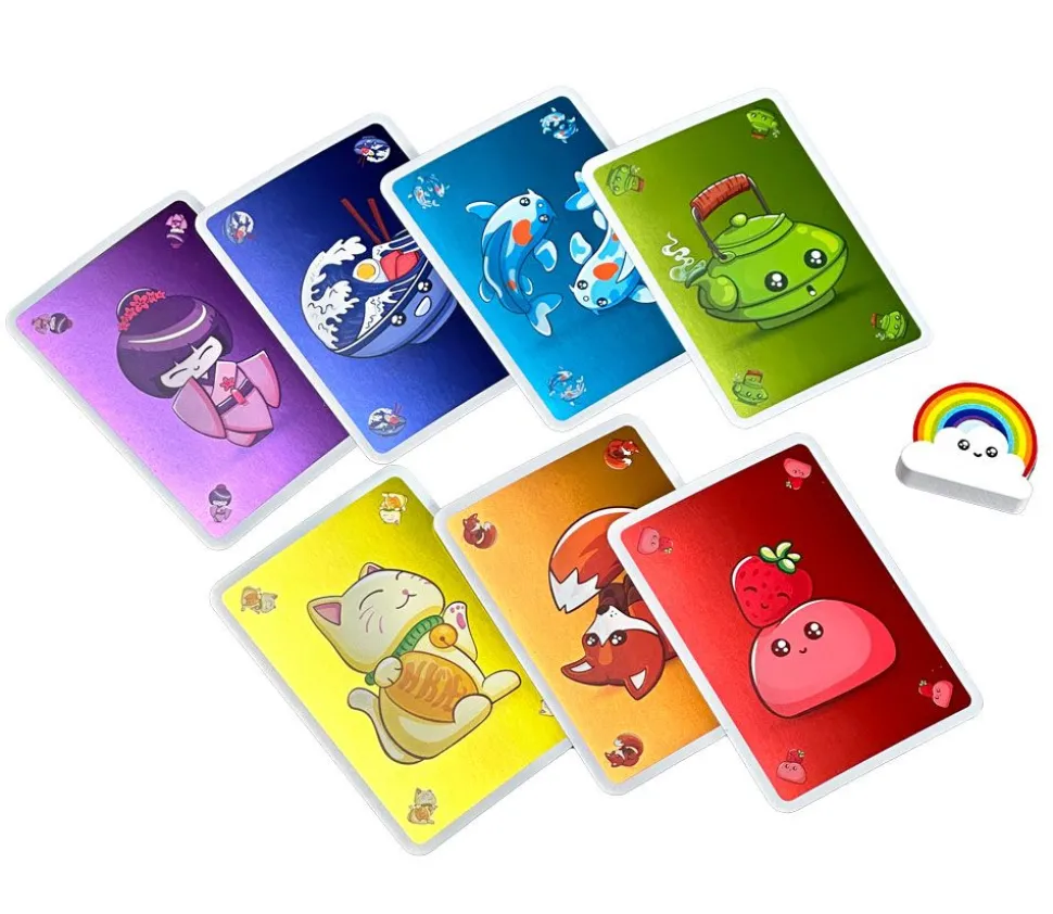 ¡Juega con ellos y consigue hacer las mejores combinaciones para ganar puntos! Intuye qué colores jugarán los demás para llevarte cartas, formar arcoíris y ser quien tenga más puntos al final de la partida. Pero, cuidado, ¡repetir colores te hará perderlos!