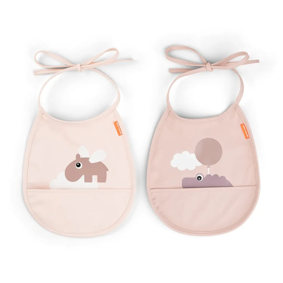 Pack de 2 baberos con bolsillo recogemigas. 100% polyester revestido con PU.