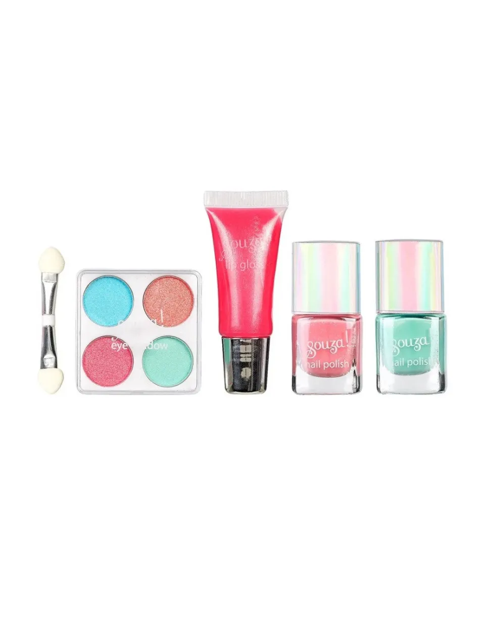 Una pack de maquillaje para niños. Estuche de maquillaje con esmalte de uñas, brillo de labios y sombra de ojos. Todo el maquillaje es a base de agua, por lo que es fácil de quitar.