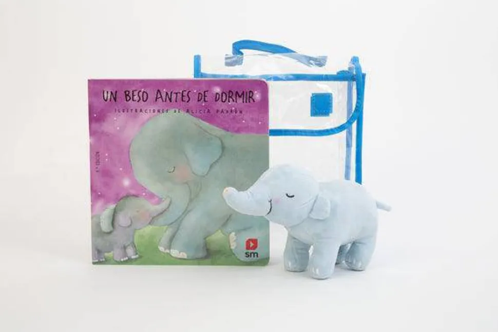Un libro de cartón con tiernas ilustraciones para leer a tu hijo antes de ir a dormir. Pack que contiene el libro Un beso antes de dormir y un peluche del personaje principal: un elefante muy tierno.
