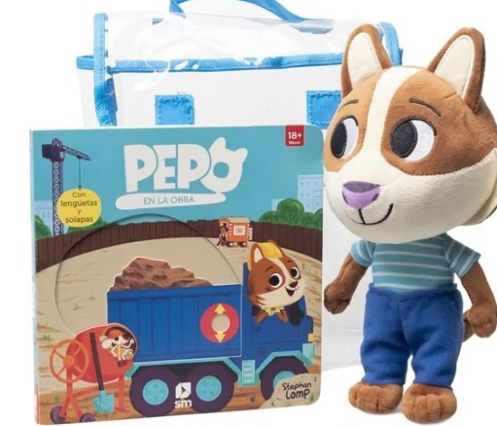 Un pack que contiene el libro Pepo en la obra y un precioso muñeco de Pepo.