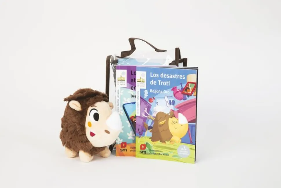 Un pack con los dos primeros títulos de la colección Troti y los Mug: Los desastres de Troti y Los Mug, atrapados en el móvil, y además, un muñeco de Troti, la mascota que siempre acompaña a los Mug y a Mía en todas sus aventuras.