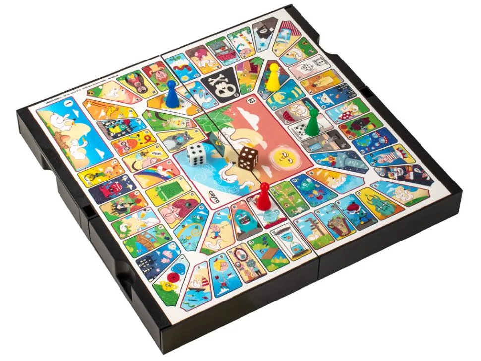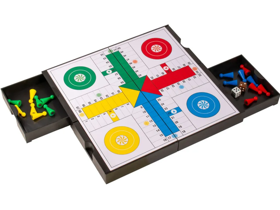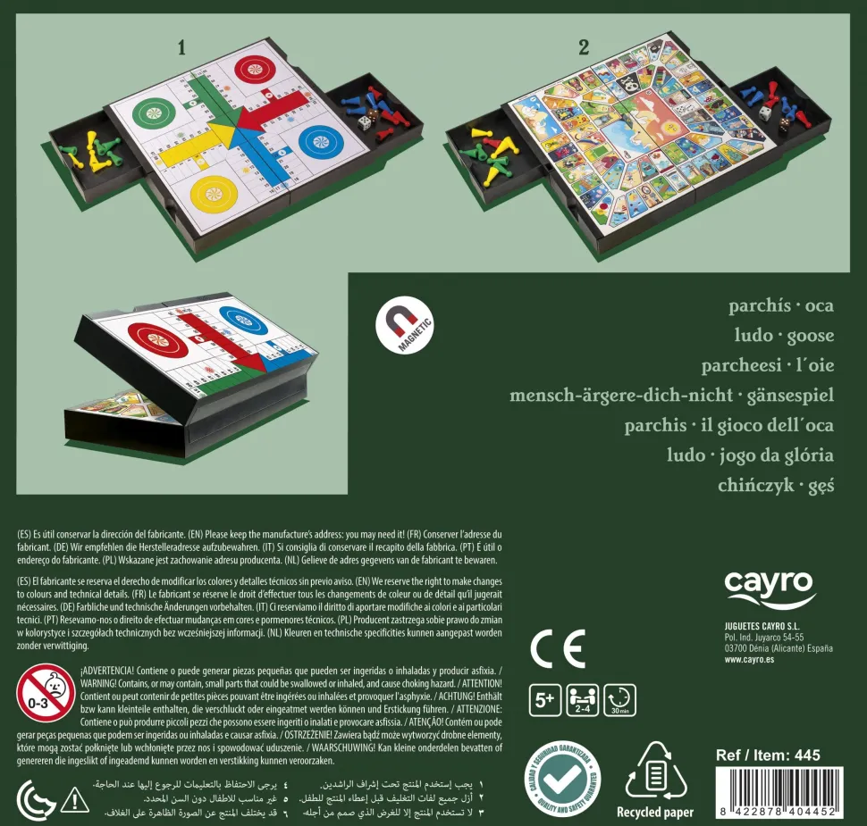 Con esta compacta caja podrás jugar a 2 juegos diferentes, parchís y oca. Las fichas (magnéticas) están alojadas en los cajones y dependiendo en la posición que coloques el tablero de juego, podrás o no abrir el cajón.