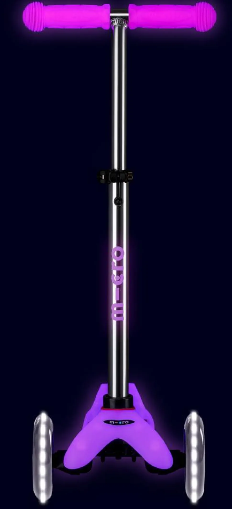 El Mini Micro ha sido elegido numerosas veces juguete del año por padres y madres. Este juguete deportivo no solo fomenta el movimiento y el ejercicio, sino que también ayuda a los niños a mejorar el equilibrio, la coordinación y las habilidades motoras finas. El manillar diseñado en forma de T hace más segura su conducción y dispone de un cierre de seguridad que hace que solo los adultos puedan desmontarlo para guardarlo. Dispone de un sistema de giro por inclinación patentado. La plataforma está fabricada con fibra de vidrio lo cual le otorga resistencia y flexibilidad. Además incluye letras de goma en relieve que son antideslizantes facilitando el manejo del patinete y dando seguridad extra a nuestros pequeños. Incorporan unas ruedas LED que funcionan a través de una dinamo, por lo que no requieren de baterías, sino que funcionan solo cuando nos movemos. Emiten una brillante luz blanca que, además de ser divertida para nuestros pequeños, les da seguridad al ser vistos con mayor facilidad en momentos de oscuridad. Por ultimo y en absoluta primicia, tanto la plataforma como los puños y el logo del manillar brillan en la oscuridad. La luz ultravioleta del ambiente diurno carga esos componentes y al llevarlos a la oscuridad hacen que el patinete que de dia tiene un tono pastel adquiera un tono neon brillante