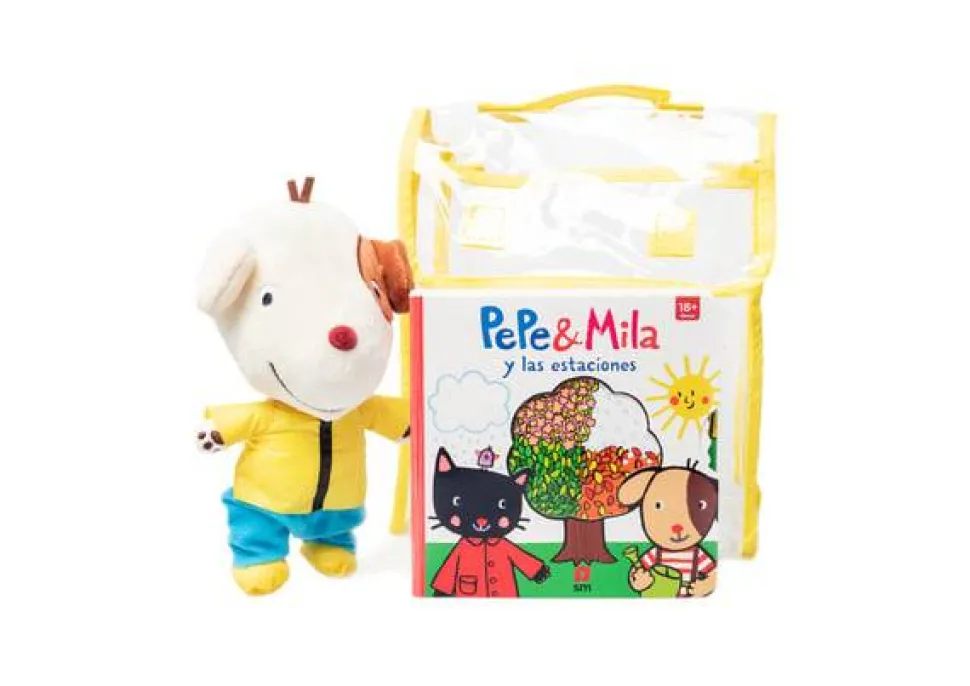 Un pack que contiene el libro Pepe & Mila y las estaciones y un muñeco de Pepe vestido con gabardina y gorro de lluvia.