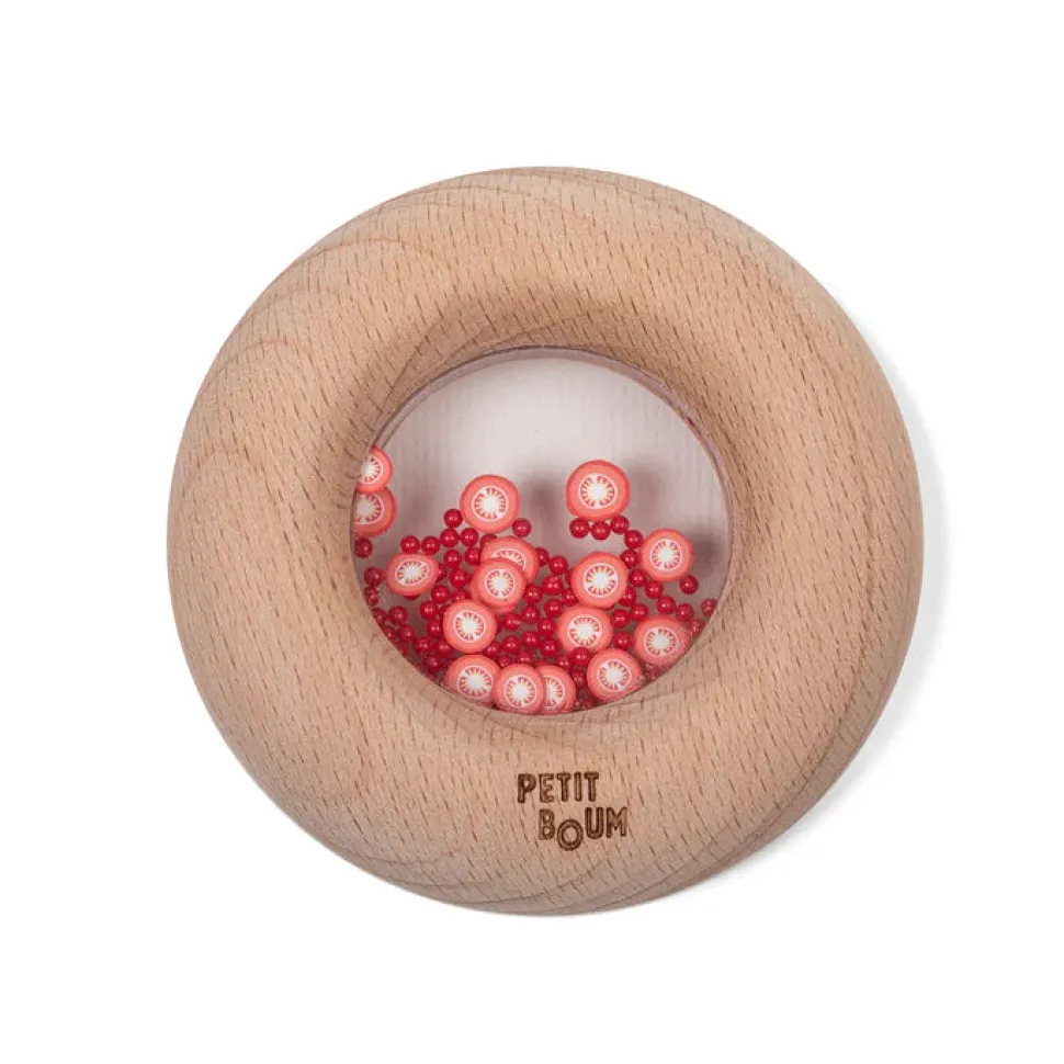 En su interior encontramos formas de frutas y verduras que, al agitarse, emiten un sonido irresistible que es la marca del Petit Boum.