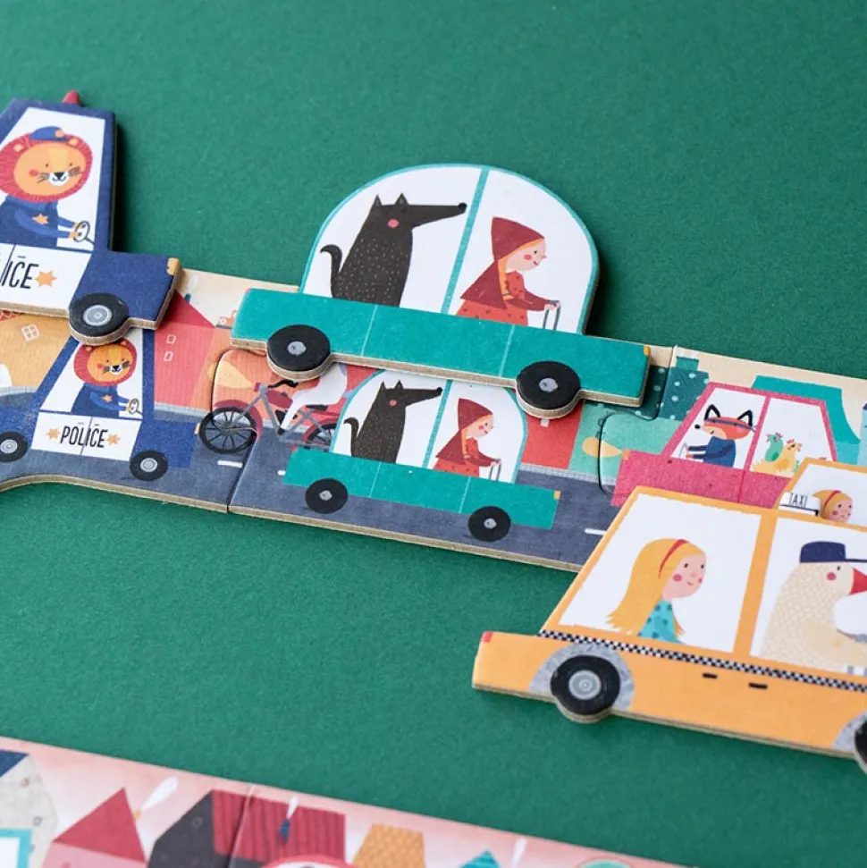Un puzzle pequeño de 24 piezas y un juego de observación de coches y bicicletas en tamaño bolsillo, para llevarlo a todas partes. Fabricado con cariño en Barcelona.