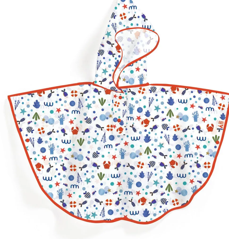 Un poncho para proteger a tu hijo o hija de la lluvia y con motivo del océano.