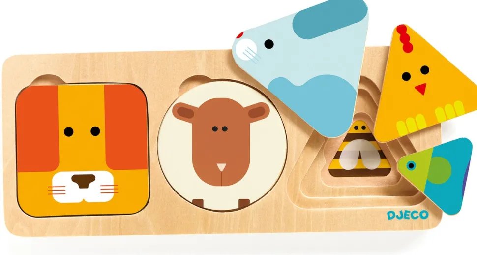 Un primer puzle de madera en 3 niveles para que los más pequeños descubran las formas y los tamaños, a partir de los 12 meses. El niño se divierte colocando las piezas en el lugar correspondiente, en función de su forma y su tamaño, en 3 niveles. Las piezas representan animales con un diseño simple y colorido.
