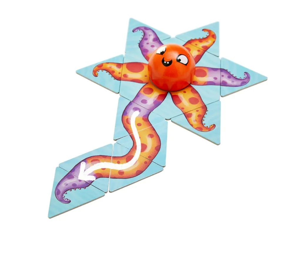 En nuestro turno giramos la cabeza del pulpito hacia el siguiente inicio de tentáculo: damos la vuelta a la colita de ese extremo y si muestra el mismo color que la colita que tenemos arriba de nuestra pila podremos colocarla, alargando dicho tentáculo. Si no muestra el mismo color, no podremos añadir nuestra ficha. Después pasa el turno al siguiente jugador.