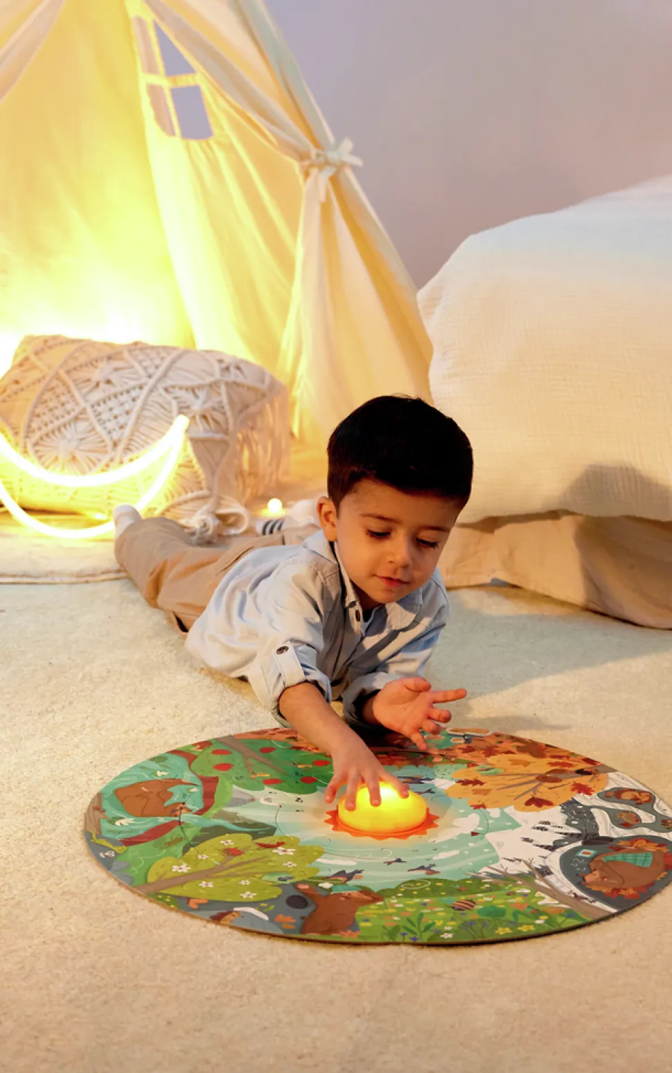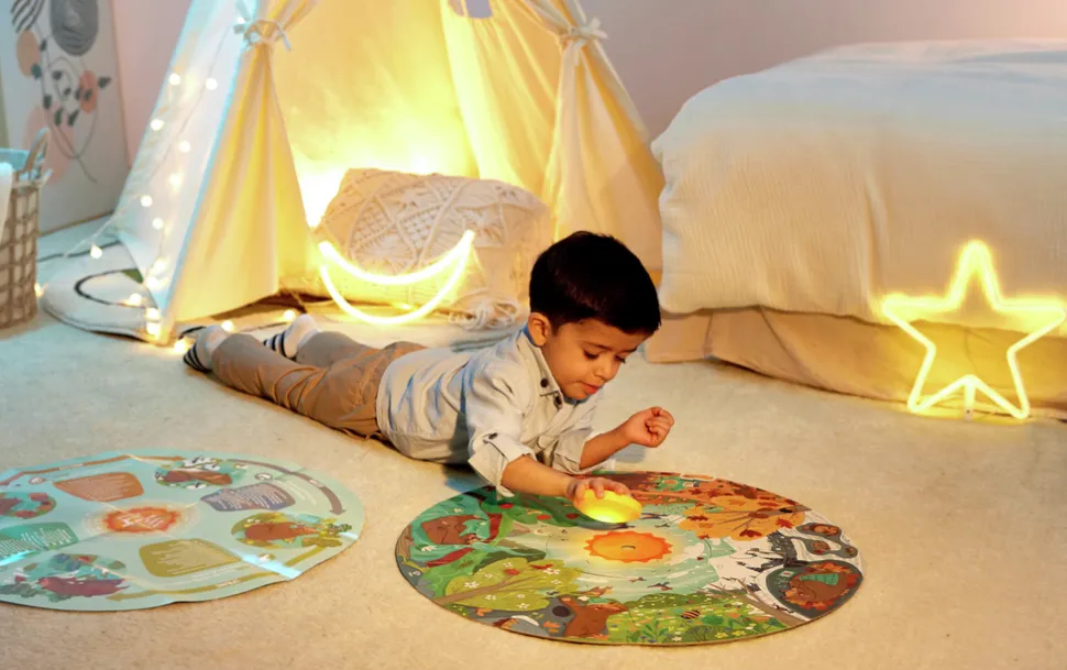 Aprende y descubre las estaciones junto al simpático oso en este increíble puzzle. Con un sol LED y un póster de doble cara, este puzzle de 16 piezas es perfecto para fomentar la imaginación y la curiosidad.