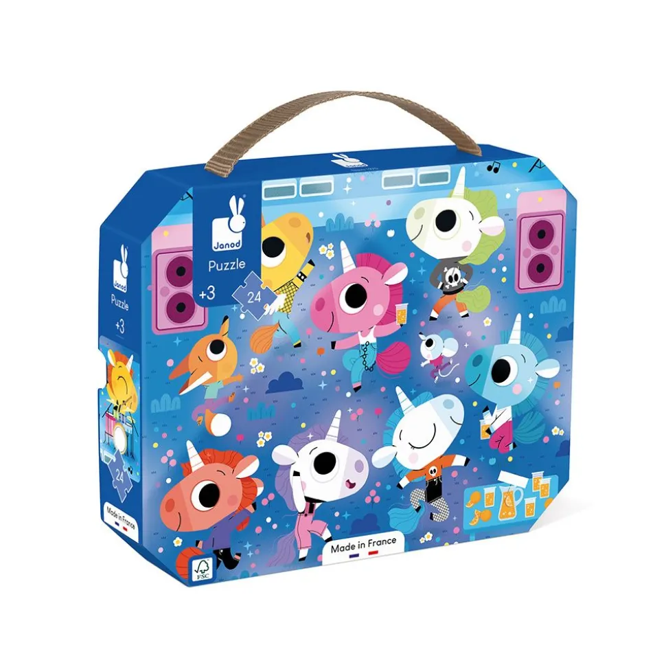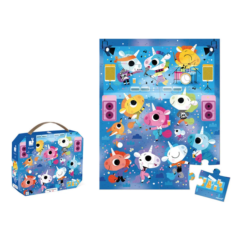 ¡Prepárate para seguir el ritmo con la cabeza! ¡Este puzle de 24 piezas te invita a un fabuloso concierto de rock a cargo de un grupo de unicornios! Los niños a partir de 3 años están listos para sumergirse en un universo musical y mágico.