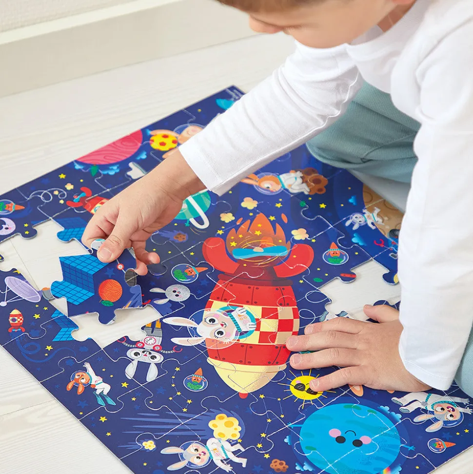 Conejito 1 a Conejito 2, ¿todo listo para la misión Zanahoria? Participa en una misión importantísima con este puzzle ilustrado que combina zanahorias, espacio y conejos astronautas, apto para niños a partir de 5 años. Con este puzle de cartón de 54 piezas, vivirás toda una experiencia de conquista espacial conejil. Viene con un póster que se puede utilizar como modelo. Las piezas se adaptan perfectamente a las manitas de los pequeños y les ayudan a desarrollar la motricidad fina.