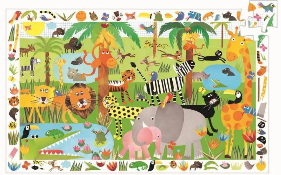 Puzle de observación de 35 piezas para descubrir los diferentes animales de la selva. ¿Qué hace el mono? ¿Dónde está el cocodrilo? El niño crea su puzle y luego se divierte encontrando los elementos de la cenefa en la imagen.