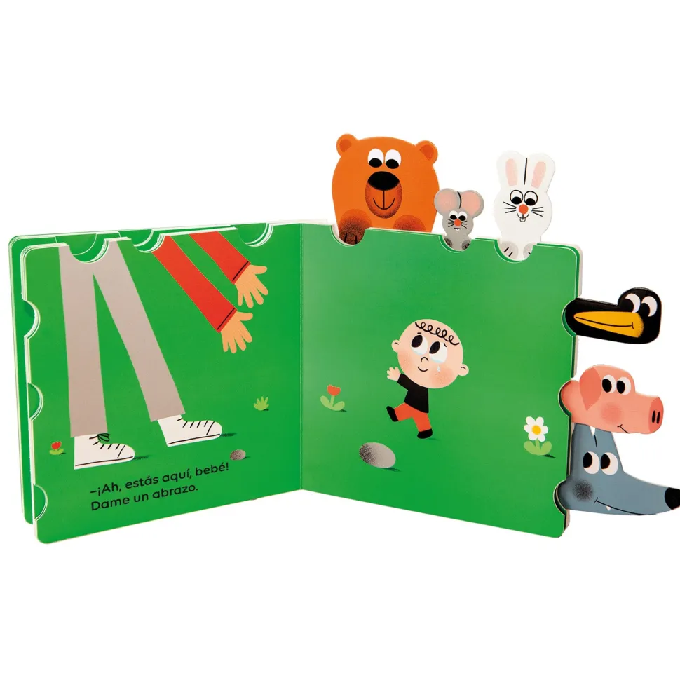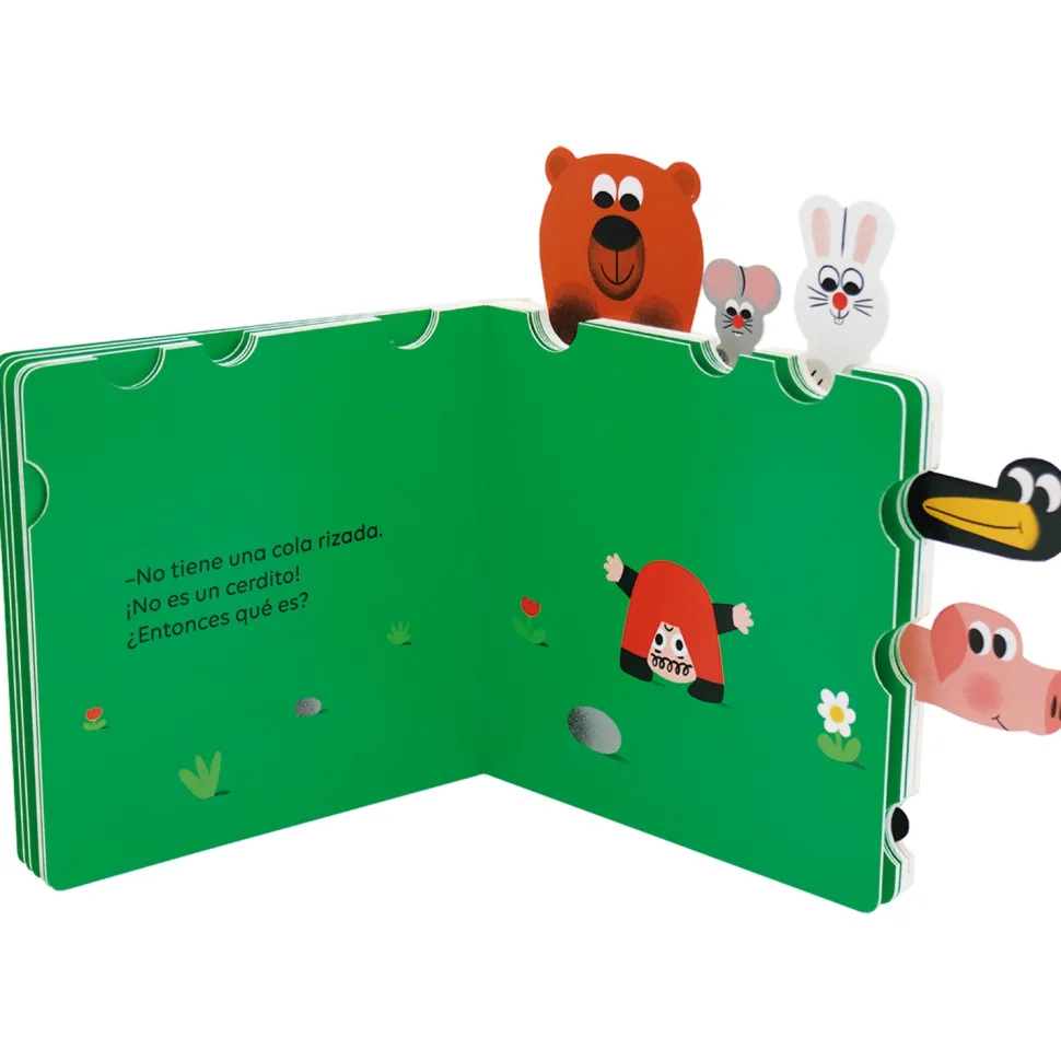 Eh, amigos, ¡venid a verlo! ¿Qué es esto? ¡Qué extraño!» Un libro animado y con lengüetas para tirar con el que los niños y las niñas se divertirán para hacer aparecer los animales en cada doble página.