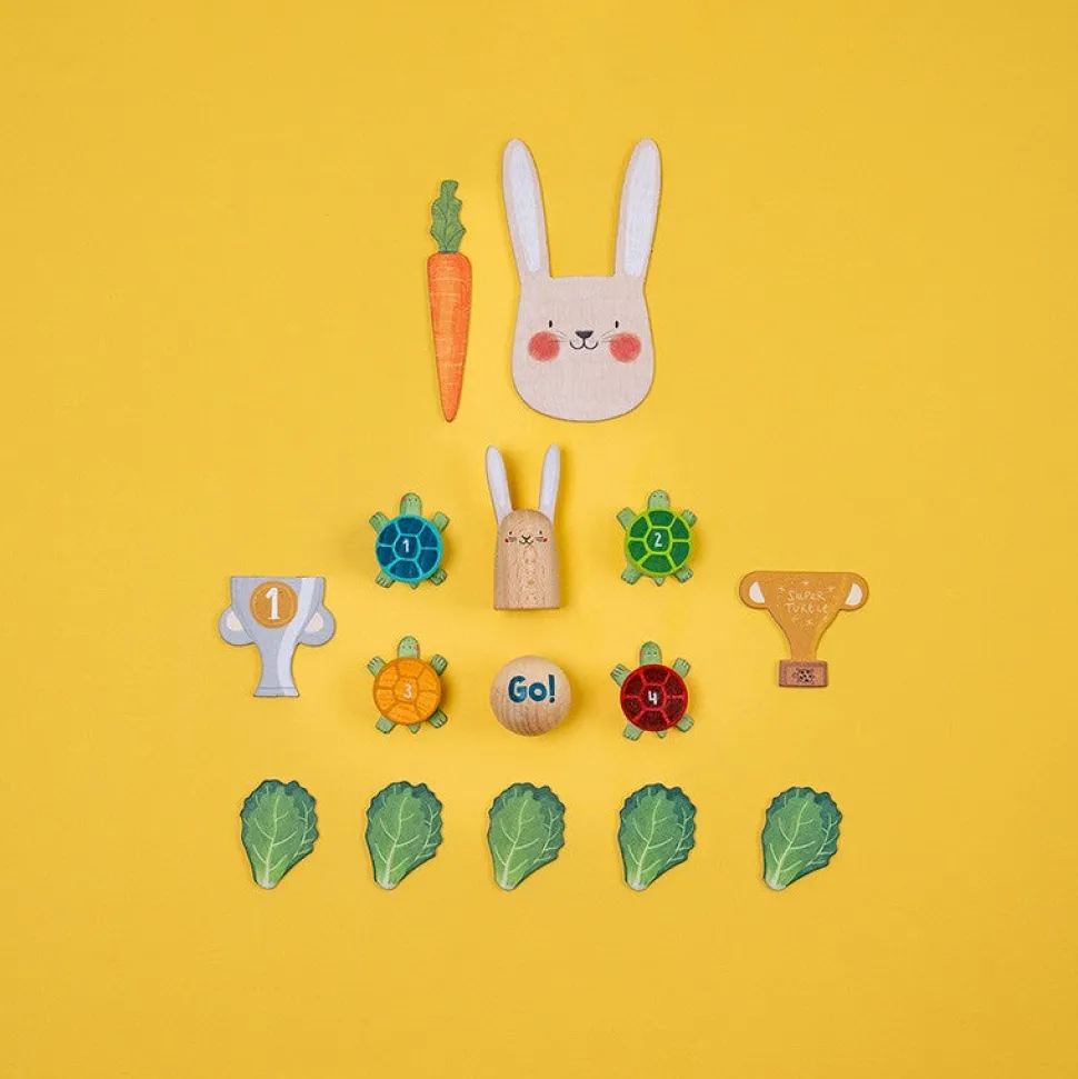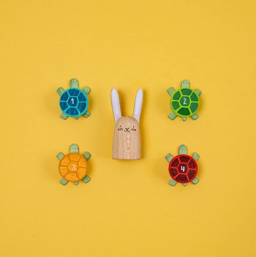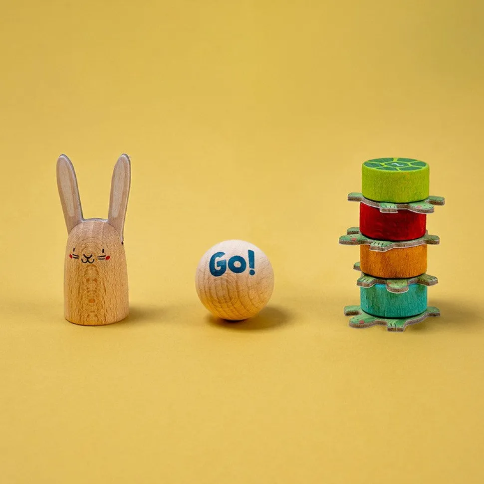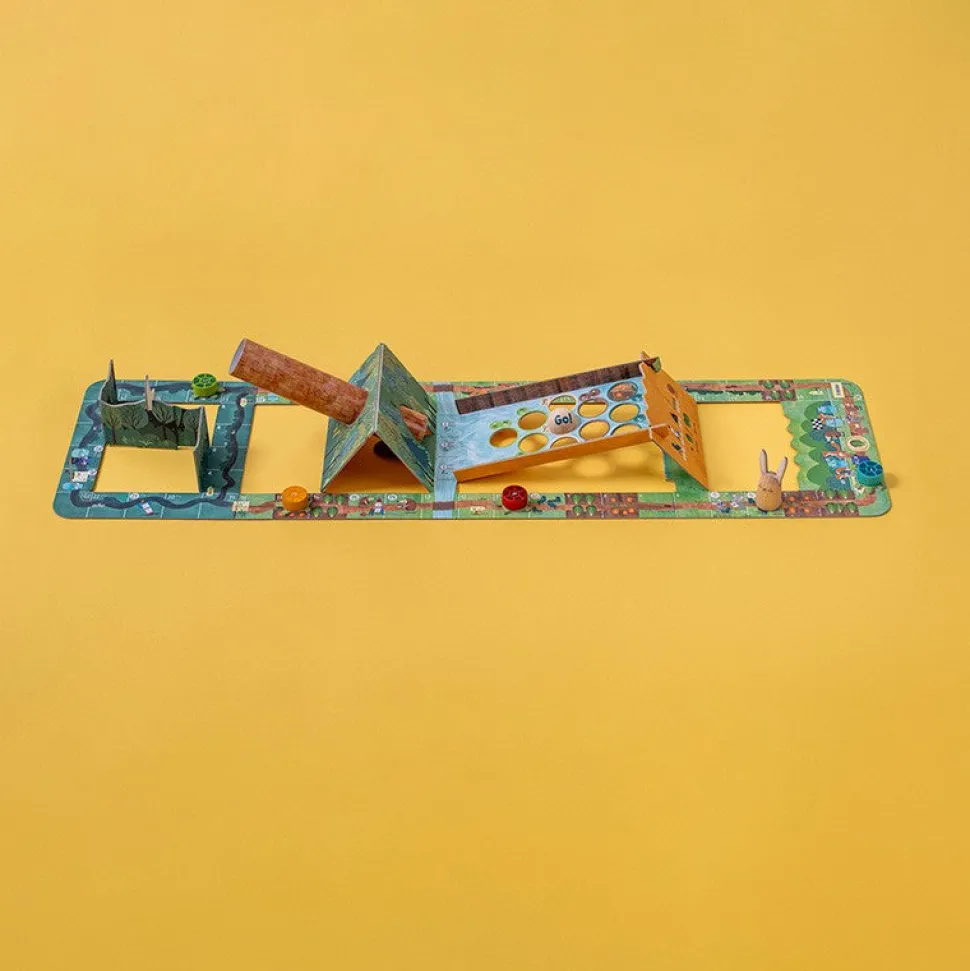 Un juego cooperativo muy divertido inspirado en la fábula de la liebre y la tortuga, a partir de 5 años. Juego sostenible hecho de cartón y madera. Fabricado en Barcelona.